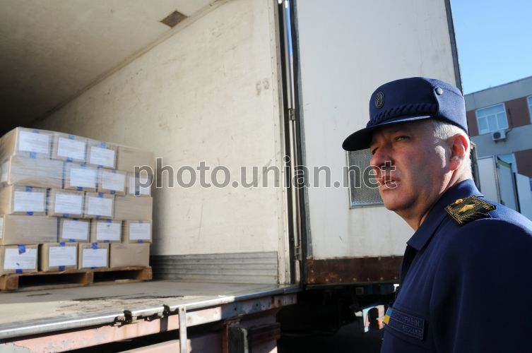 Председатель ГСЧС Украины Николай Чечеткин во время отправки грузовиков с гуманитарной помощью из Харькова на восток Украины, 8 октября 2015 г. Из Харькова на восток Украины отправились шесть грузовиков с правительственной гуманитарной помощью. В соответствии с распоряжением КМУ от 5 августа, из Госрезерва было выделено около 6 млн грн Минэкономразвития на приобретение продовольственной гуманитарной помощи для внутренне перемещенных лиц, которые проживают в Донецкой и Луганской обл. На эти средства закуплено 60 тыс. банок рыбных консервов и 80 тонн сливочного масла для доставки в восточные регионы. Фото Владимир Андреев / УНИАН