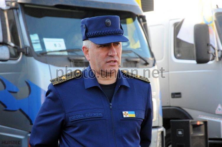 Председатель ГСЧС Украины Николай Чечеткин во время отправки грузовиков с гуманитарной помощью из Харькова на восток Украины, 8 октября 2015 г. Из Харькова на восток Украины отправились шесть грузовиков с правительственной гуманитарной помощью. В соответствии с распоряжением КМУ от 5 августа, из Госрезерва было выделено около 6 млн грн Минэкономразвития на приобретение продовольственной гуманитарной помощи для внутренне перемещенных лиц, которые проживают в Донецкой и Луганской обл. На эти средства закуплено 60 тыс. банок рыбных консервов и 80 тонн сливочного масла для доставки в восточные регионы. Фото Владимир Андреев / УНИАН