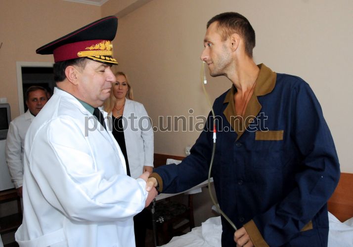 Министр обороны Украины Степан Полторак вручает государственную награду бойцу, раненому в зоне проведения АТО, в Военно-медицинском клиническом центре, в Харькове, 28 октября 2015 г. Фото Владимир Андреев / УНИАН