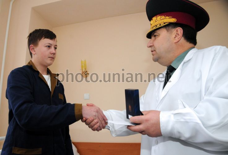 Министр обороны Украины Степан Полторак вручает государственную награду бойцу, раненому в зоне проведения АТО, в Военно-медицинском клиническом центре, в Харькове, 28 октября 2015 г. Фото Владимир Андреев / УНИАН