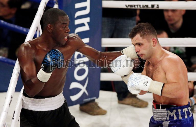 Украинский боксер-любитель Дмитрий Митрофанов и боксер-любитель из Эквадора Марло Дельгадо во время боя в рамках серии AIBA Pro Boxing (APB) в Киеве, 12 декабря 2015 г. Фото Соловьев Валерий / УНИАН