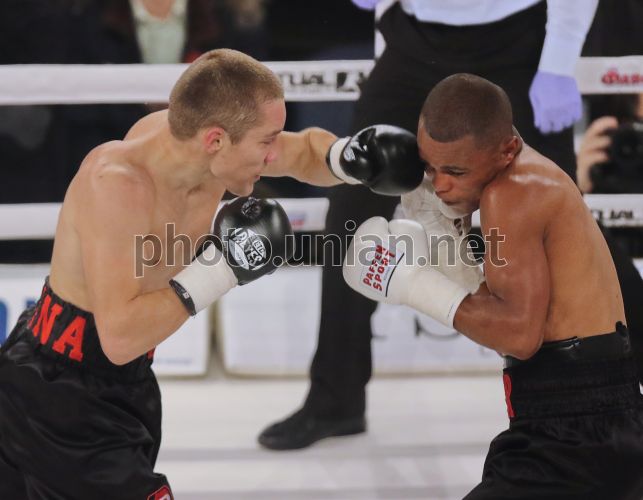 Украинский боксер Олег Малиновский и бразильский боксер Алдимар Сантос во время боя, в Киеве, 12 декабря 2015 г. Украинский боксер Олег Малиновский победил по очкам бразильца Алдимара Сантоса. Фото Соловьев Валерий / УНИАН