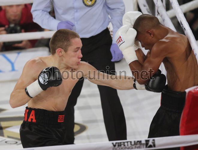 Украинский боксер Олег Малиновский и бразильский боксер Алдимар Сантос во время боя, в Киеве, 12 декабря 2015 г. Украинский боксер Олег Малиновский победил по очкам бразильца Алдимара Сантоса. Фото Соловьев Валерий / УНИАН