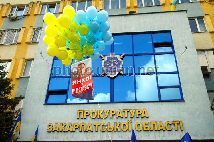 Портрет областного прокурора Закарпатской области Владимира Янко, прикрепленный к воздушным шарикам, во время митинга в Ужгороде, 26 апреля 2016 г. Фото Немеш Янош / УНИАН