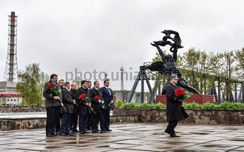 Президент Украины Петр Порошенко во время возложения цветов к памятнику Героям Чернобыля в Припяти (Киевская обл. ), 26 апреля 2016 г. Президент Украины Петр Порошенко по случаю 30-й годовщины аварии на ЧАЭС посетил зону отчуждения. Фото Лазаренко Николай / POOL / УНИАН