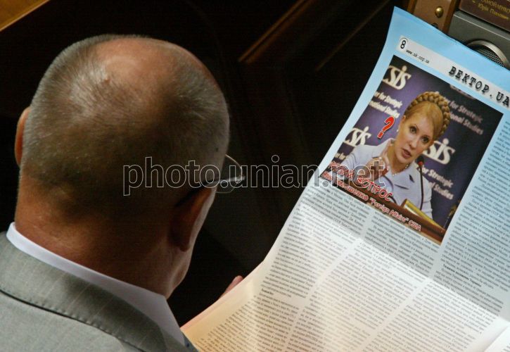 COMM Народный депутат от Партии регионов читает газету в сессионном зале Верховной Рады в Киеве во вторник, 5 июня 2007 г. В этот день Президент Украины Виктор Ющенко подписал Указ о назначении внеочередных выборов в Верховную Раду Украины на 30 сентября 2007 г. Фото Сергея Светлицкого / УНИАН