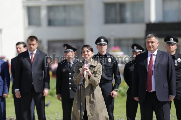 Министр внутренних дел Украины Арсен Аваков и председатель Национальной полиции Украины Хатия Деканоидзе во время церемонии принятия присяги сотрудниками новой патрульной полиции, в Сумах, 12 мая 2016 г. Фото Бабич Юлия / УНИАН