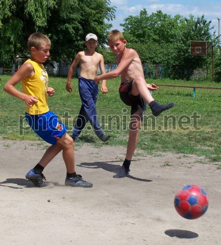 COMM Дети играют в футбол в пришкольном лагере ”Лучик” в с. Озадовка Бердичевского р-на Житомирской обл. в четверг, 7 июня 2007 г. Для бесплатного оздоровления 1600 детей в 27 пришкольных лагерях из районного бюджета выделили больше 100 тыс. грн. Фото Владимира Соболя / УНИАН