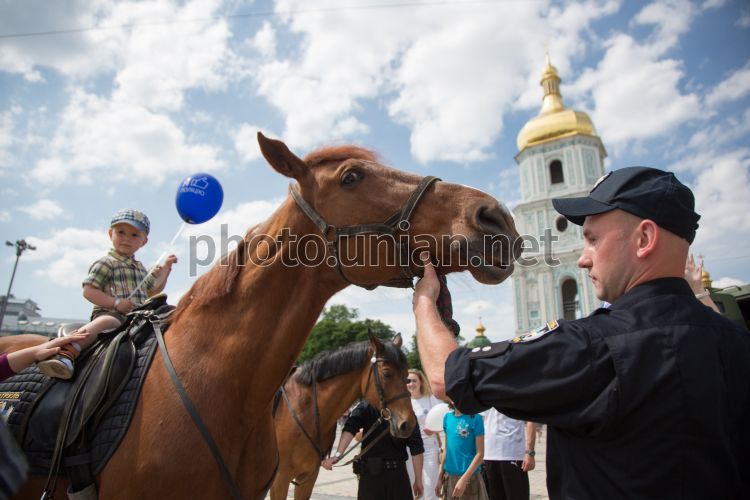 Сотрудник полиции возле лошади (конный патруль) во время благотворительной акции "За нами будущее", посвященной Дню защиты детей, на Софийской площади в Киеве, 4 июня 2016 г. Во время акции показательные выступления продемонстрировали кинологи со служебными собаками, конные и велопатрули. Фото Соколовская Инна / УНИАН