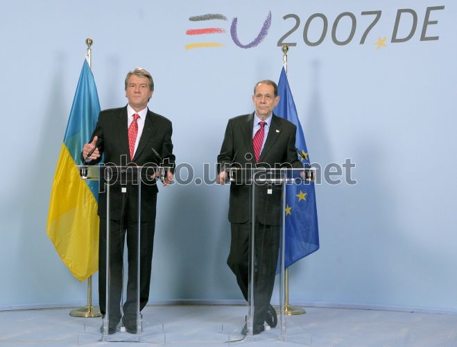 COMM Президент Украины Виктор Ющенко, слева, и Генеральный секретарь Совета ЕС, Верховный представитель ЕС по вопросам общей внешней политики и политики безопасности Хавьер Солана во время встречи со СМИ в Брюсселе (Бельгия) в четверг, 21 июня 2007 г. Стороны обсудили отношения Украины и Евросоюза и внутриполитическую ситуацию в Украине. Фото Николая Лазаренко / POOL / УНИАН