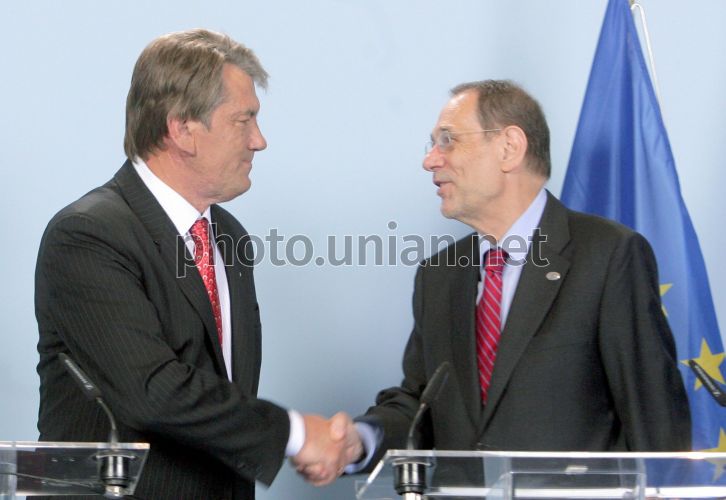 COMM Президент Украины Виктор Ющенко, слева, и Генеральный секретарь Совета ЕС, Верховный представитель ЕС по вопросам общей внешней политики и политики безопасности Хавьер Солана во время встречи со СМИ в Брюсселе (Бельгия) в четверг, 21 июня 2007 г. Стороны обсудили отношения Украины и Евросоюза и внутриполитическую ситуацию в Украине. Фото Николая Лазаренко / POOL / УНИАН
