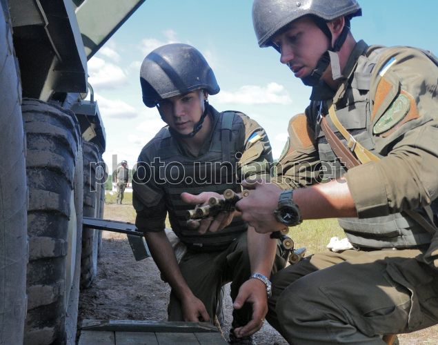 Курсанты ускоренного выпуска офицеров Национальной академии Национальной гвардии держат патроны к крупнокалиберному пулемету "Утес" во время полевого выхода с учебными стрельбами, на полигоне в селе Башкировка Чугуевского р-на Харьковской области, 7 сентября 2016 г. Фото Мариенко Андрей / УНИАН