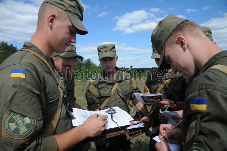 Курсанты ускоренного выпуска офицеров Национальной академии Национальной гвардии ориентируются на местности во время полевого выхода с учебными стрельбами, на полигоне в селе Башкировка Чугуевского р-на Харьковской области, 7 сентября 2016 г. Фото Мариенко Андрей / УНИАН