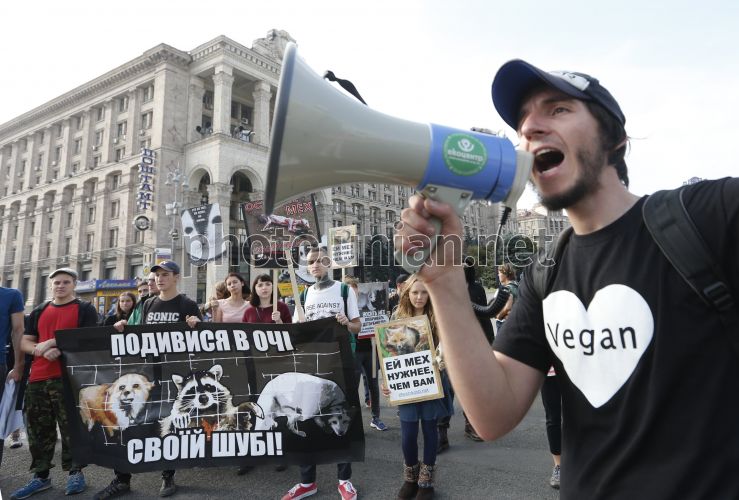 Участники антимехового марша "ХутроOFF" в Киеве, 2 октября 2016 г. Участники антимехового марша прошли по центру города с лозунгами и плакатами, чтобы привлечь внимание к жестокости мехового бизнеса. Фото Гонтар Владимир / УНИАН