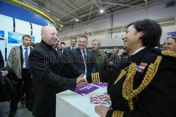 Министр внутренних дел Украины Арсен Аваков, в центре, секретарь СНБО Александр Турчинов, слева, во время открытия ХІІІ Международной специализированной выставки "Оружие и безопасность-2016" и Х Международного авиакосмического салона "Авиасвит-XXI" в Киеве, 11 октября 2016 г. Фото Бабич Юлия / УНИАН