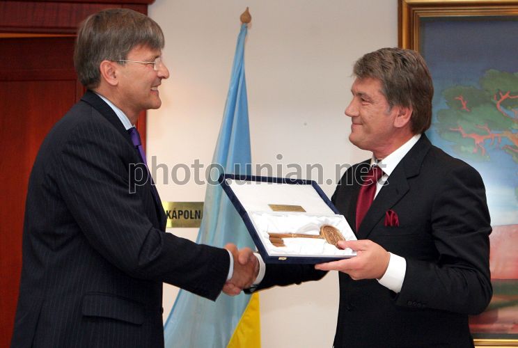 COMM Мэр Будапешта Габор Демски, слева, вручает Президенту Украины Виктору Ющенко символический ключ от города в Будапеште (Венгрия) в среду, 11 июля в 2007 г. 10-11 июля Ющенко находится с государственным визитом в Венгрии. Фото Николая Лазаренко / POOL / УНИАН