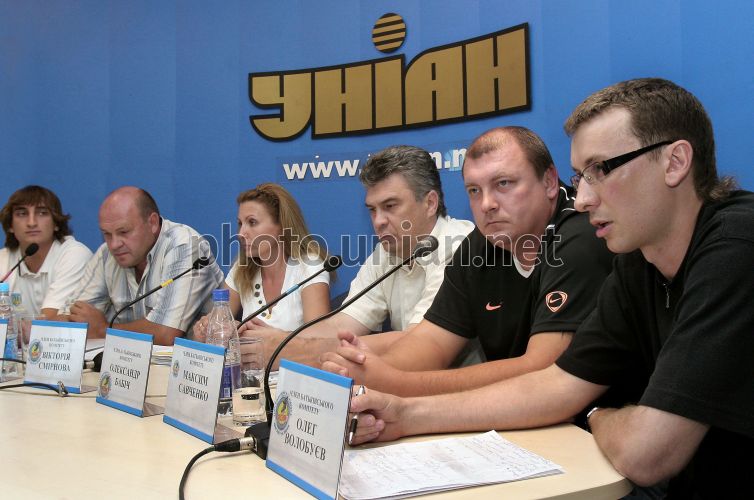 СОММ Справа налево: члены родительского комитета харьковской специализированной детско-юношеской спортивной школы олимпийского резерва Олег Волобуев, Максим Савченко, Александр Бабич, Виктория Смирнова, тренер "Дружбы-78" и молодежной сборной Украины по хоккею с шайбой Олег Чекрышов и игрок Национальной молодежной сборной Украини по хоккею Дмитрий Найда на пресс-конференции на тему: “Юные хоккеисты “Дружбы-78” вынуждены бежать от коррупции и произвола в США”, в Киеве, в субботу, 14 июля 2007 г. Члены родительского комитета приехали в Киев, чтобы обратиться к Президенту Украины за помощью в наведении порядка в школе и обеспечения нормальных условий для тренировок детей. Фото Александра Синицы / УНИАН