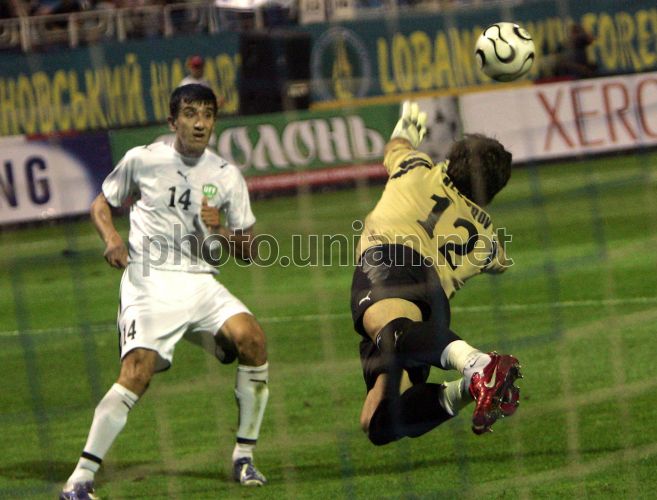 CОММ Вратарь сборной Узбекистана Игнатий Нестеров (№12), справа, отбивает мяч, и игрок сборной Узбекистана Никмат Хашумов (№14) во время товарищеского матча национальных футбольных сборных Украины и Узбекистана в Киеве, в среду, 22 августа 2007 г. Матч закончился со счетом 2 : 1 в пользу сборной Украины. Фото Александра Синицы / УНИАН