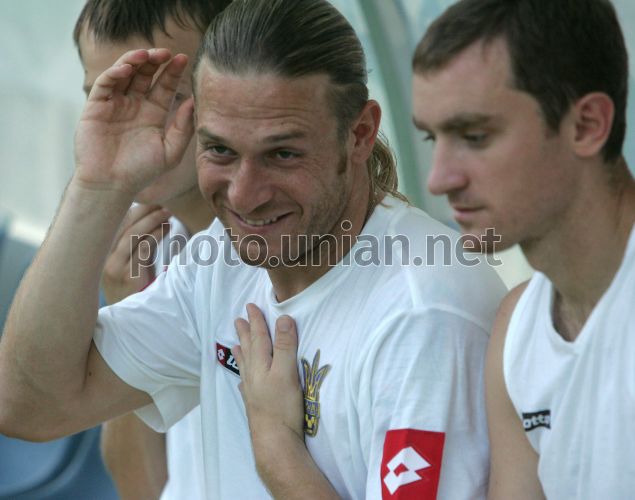 CОММ Игроки сборной Украины Андрей Воробей (№7), справа, и Андрей Воронин (№10) перед товарищеским матчем национальных футбольных сборных Украины и Узбекистана в Киеве, в среду, 22 августа 2007 г. Матч закончился со счетом 2 : 1 в пользу сборной Украины. Фото Александра Синицы / УНИАН