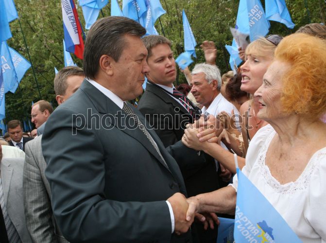 СОММ Премьер-министр Украины Виктор Янукович приветствует своих сторонников, которые собрались на улицах города с флагами Партии регионов, во время торжественного открытия Крымского республиканского учреждения «Универсальная библиотека им. И.Я.Франко» в Симферополе в пятницу, 31 августа 2007 г. Фото Андрея Мосиенко / УНИАН
