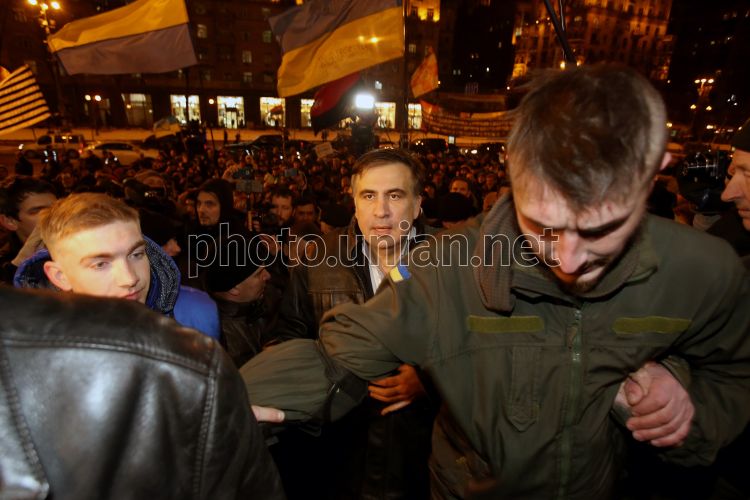 Лидер партии "Движение новых сил", экс-председатель Одесской ОГА Михеил Саакашвили со своими сторонниками после завершения заседания суда, который отказался избрать для него меру пресечения в виде круглосуточного домашнего ареста, в Киеве, 11 декабря 2017 г. Фото Соколовская Инна / УНИАН