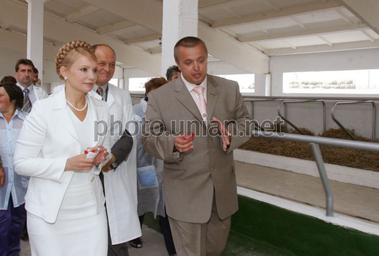 СОММ Лидер БЮТ Юлия Тимошенко, слева, и директор корпорации ”Сварог-2006” Андрей Гордийчук, справа, осматривают ферму во время торжественного открытия евромолочного комплекса в селе Большая Медведивка Шепетовского района Хмельницкой области в четверг, 6 сентября 2007 г. Комплекс принадлежит корпорации «Сварог 2006». Фото Александра Прокопенко / POOL / УНИАН