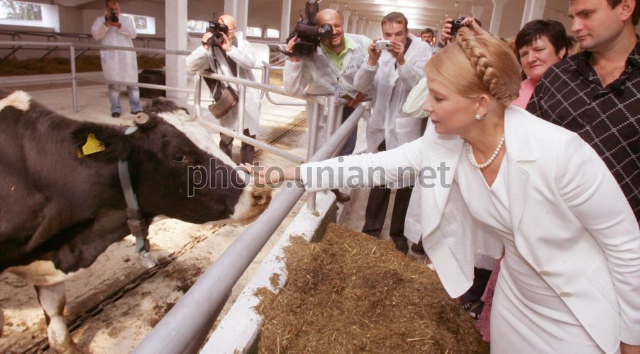 СОММ Лидер БЮТ Юлия Тимошенко гладит корову во время посещения только что открытого евромолочного комплекса в селе Большая Медведивка Шепетовского района Хмельницкой области в четверг, 6 сентября 2007 г. Комплекс принадлежит корпорации «Сварог 2006». Фото Александра Прокопенко / POOL / УНИАН