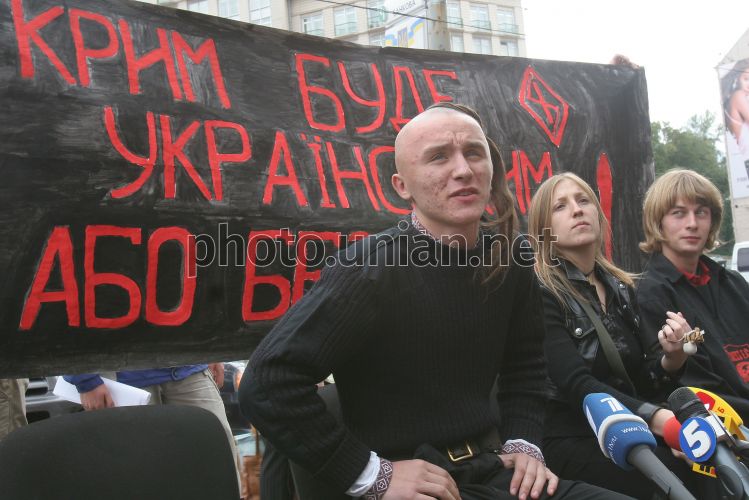 Слева направо: представители крайних правых националистических организаций Роман Любчик, Лариса Товстун и Семен Васюк на пресс-конференции ”Анонс осенних мероприятий по ликвидации автономности Крыма” возле УНИАН в Киеве, во вторник, 11 сентября 2007 г. В ходе пресс-конференции участники объявили всеукраинскую акцию – Марш на Крым «Крым будет украинским, или безлюдным». По словам участников, Марш на Крым завершится в Симферополе «блокированием главных антигосударственных учреждений: Крымского «парламента» и Совета министров «Автономной Республики Крым»». Участники акции считают главным заданием Марша – безоговорочную отмену автономии Крыма, предоставление Крымскому полуострову статуса области.Фото Александра Синицы / УНИАН