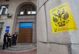 Плакат с надписью "Громадська кампанія "Інтеру - бойкот" возле здания Национального совета по вопросам телевидения и радиовещания, в Киеве, 27 июня 2018 г. В этот день в Киеве активисты организации "Свободные люди" выступили с призывом лишить телеканал "Интер" лицензии. Фото Соколовская Инна / УНИАН