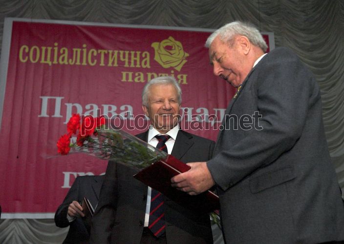 Председатель ВР Украины 5-го созыва Александр Мороз, слева, вручает Почетную грамоту ВР бывшему главному инженеру отдела внешних связей и технического перевода ОАО «Херсонский судостроительный завод» Валентину Трубачу во время рабочей поездки в г. Херсон в четверг, 27 сентября 2007 г. Фото Анастасии Сироткиной / POOL / УНИАН