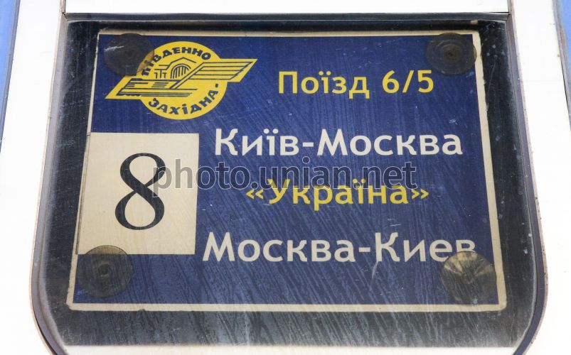 Табличка с номером вагона на окне поезда №6/5, следующего по маршруту Киев-Москва, на перроне Центрального вокзал в Киеве, 6 августа 2018 г. Фото Гонтар Владимир / УНИАН