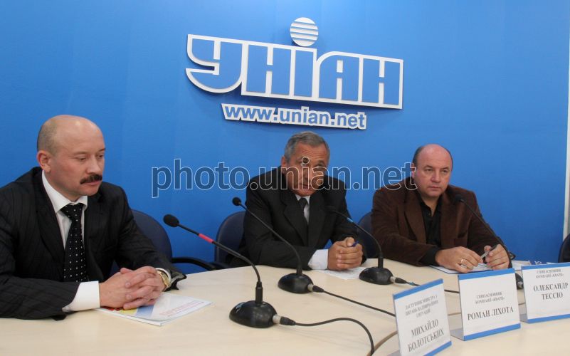 Слева направо: заместитель министра Украины по вопросам чрезвычайных ситуаций Михаил Болотских, соучредители компании "Кварц" Роман Лихота и Александр Тессио на пресс-конференции на тему: “Причины масштабных лесных пожаров в Херсоне. Иной взгляд” в Киеве, в пятницу, 28 сентября 2007 г. Фото Сергея Светлицкого / УНИАН
