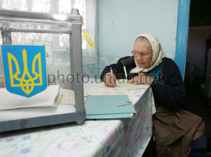 Пенсионерка, голосующая на дому, расписывается в получении избирательного бюллетеня в с. Высшая Дубечня Вышгородского р-на Киевской обл. в воскресенье, 30 сентября 2007 г. В этот день в Украине проходят внеочередные выборы в Верховную Раду Украины. Фото Виктора Побединского / УНИАН