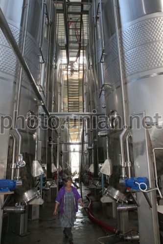 Работница цеха первичной переработки винограда завода марочных вин и коньяков ”Коктебель” (АРК Крым) выполняет свою работу в среду, 26 сентября 2007 г. Каждый сорт винограда собирается отдельно и перерабатывается по сортам. Сначала ягоды отделяется с гребней, затем они поступают в дробилку, и получается мезга (или раздавленная ягода), которая по трубопроводу поступает в мембранный пресс. Дальше, полученную мезгу отправляют на брожение (процесс превращения сока в вино). Температура брожения красного вина должна быть от 28 до 32 градусов, а белого - не должна превышать 16- 18 градусов по Цельсию. Далее вино снимают с дрожжей, а затем снова по трубопроводам переливают в следующие емкости, где оно очищается и далее уже приобретает товарный вид. Фото Алексея Сувирова / УНИАН