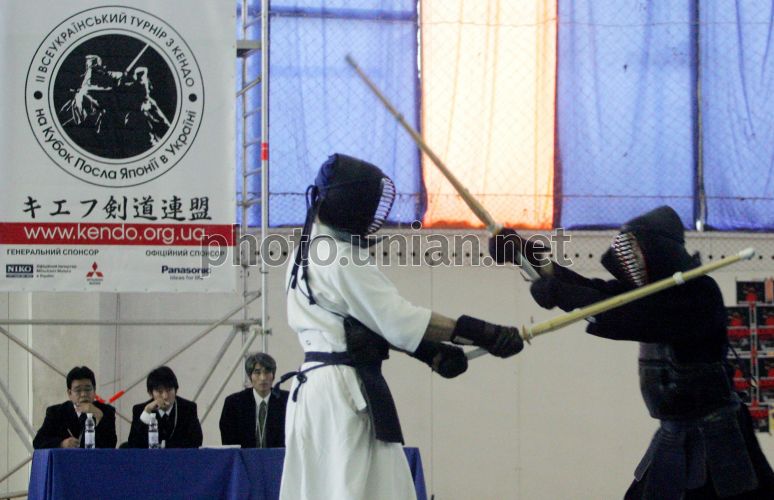 Участники единственного в Украине турнира по кендо, организованного Киевской федерацией кендо на Кубок Посла Японии в Украине, проводят поединок в Киеве в субботу, 13 октября 2007 г. В программе турнира - соревнование в индивидуальном и командном зачете. Фото Сергея Светлицкого / УНИАН