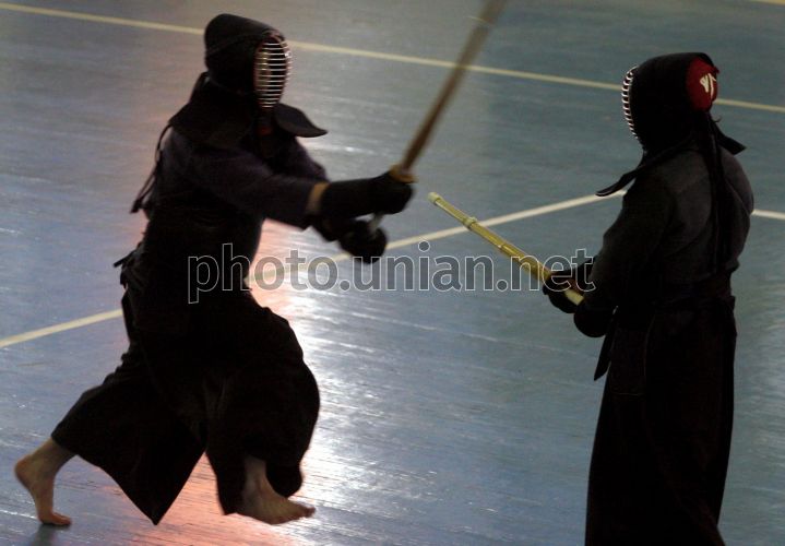 Участники единственного в Украине турнира по кендо, организованного Киевской федерацией кендо на Кубок Посла Японии в Украине, проводят поединок в Киеве в субботу, 13 октября 2007 г. В программе турнира - соревнование в индивидуальном и командном зачете. Фото Сергея Светлицкого / УНИАН