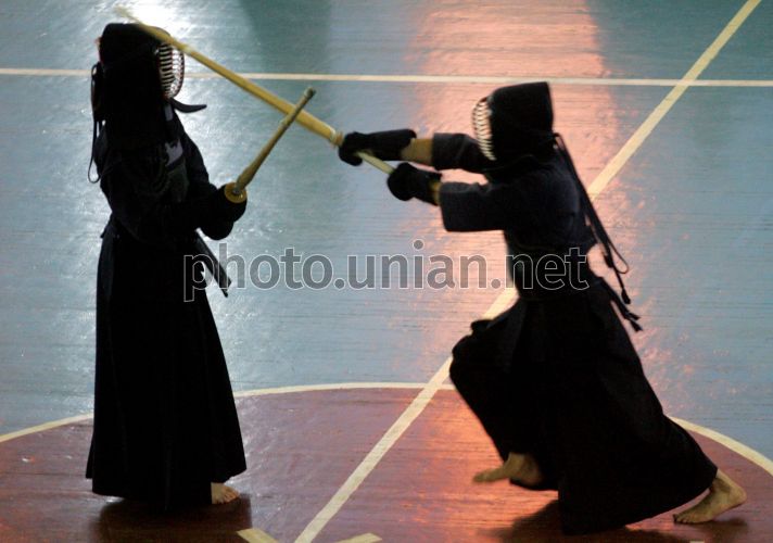 Участники единственного в Украине турнира по кендо, организованного Киевской федерацией кендо на Кубок Посла Японии в Украине, проводят поединок в Киеве в субботу, 13 октября 2007 г. В программе турнира - соревнование в индивидуальном и командном зачете. Фото Сергея Светлицкого / УНИАН