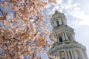 Фонтан "Водяной шар" на фоне здания со шпилем на Майдане Незалежности в Киеве, 27 апреля 2019 г. В этот день состоялся запуск светомузыкальных фонтанов после зимнего перерыва. Новый сезон работы фонтанов в центре столицы открыт. Фото Соколовская Инна / УНИАН