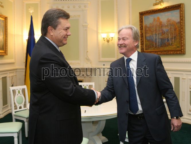 Премьер министр Украины Виктор Янукович и советник основателя шведской компании IKEA Леннарт Дальгрен во время встречи, посвященной расширению деятельности компании в Украине, в Киеве, в четверг, 18 октября в 2007 г. На встрече также присутствовал советник по инвестиционным вопросам компании IKEA Холм Свен. Европейский банк реконструкции и развития может предоставить шведской компании до четырех кредитов на общую сумму 100 млн. дол. на развитие бизнеса в Украине. В июне этого года компания заявила о намерении приобрести земельный участок под г. Харьков для строительства торгового центра. Фото Андрея Мосиенко / POOL / УНИАН