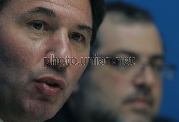 Партнер, управляющий директор американской юридической компании в Украине „Marks, Sokolov & Burd, LLC” Брюс Маркс, слева, и управляющий директор Киевского офиса компании Джин Берд во время пресс-конференции в УНИАН, посвященной открытию компании „Marks, Sokolov & Burd, LLC” в Украине, в Киеве в четверг, 25 октября 2007 г. Юридическая компания „Marks, Sokolov & Burd, LLC” представляет большие компании, которые производят FMCG, и другие компании в судебных разбирательствах относительно защиты прав потребителей. Кроме того, компания представляет интересы Украины в США, а также интересы западных компаний в больших международных процессах, связанных с ведением бизнеса в Украине. Фото Сергея Светлицкого / УНИАН