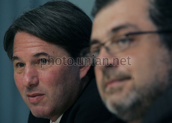 Партнер, управляющий директор американской юридической компании в Украине „Marks, Sokolov & Burd, LLC” Брюс Маркс, слева, и управляющий директор Киевского офиса компании Джин Берд во время пресс-конференции в УНИАН, посвященной открытию компании „Marks, Sokolov & Burd, LLC” в Украине, в Киеве в четверг, 25 октября 2007 г. Юридическая компания „Marks, Sokolov & Burd, LLC” представляет большие компании, которые производят FMCG, и другие компании в судебных разбирательствах относительно защиты прав потребителей. Кроме того, компания представляет интересы Украины в США, а также интересы западных компаний в больших международных процессах, связанных с ведением бизнеса в Украине.