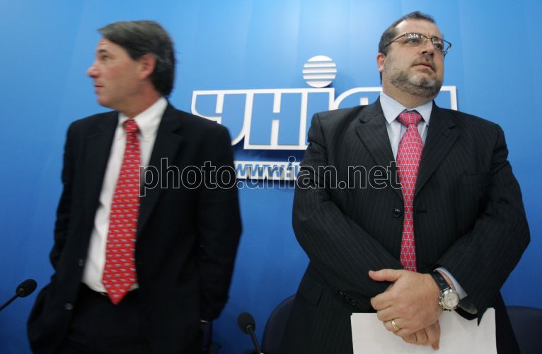 Партнер, управляющий директор американской юридической компании в Украине „Marks, Sokolov & Burd, LLC” Брюс Маркс, слева, и управляющий директор Киевского офиса компании Джин Берд после окончания пресс-конференции в УНИАН, посвященной открытию компании „Marks, Sokolov & Burd, LLC” в Украине, в Киеве в четверг, 25 октября 2007 г. Юридическая компания „Marks, Sokolov & Burd, LLC” представляет большие компании, которые производят FMCG, и другие компании в судебных разбирательствах относительно защиты прав потребителей. Кроме того, компания представляет интересы Украины в США, а также интересы западных компаний в больших международных процессах, связанных с ведением бизнеса в Украине. Фото Сергея Светлицкого / УНИАН