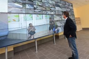 Мэр Запорожья Владимир Буряк, второй слева, осматривает видеостену в ситуационном центре, в Запорожье, 20 августа 2019 г. В Запорожье заработает ситуационный центр, созданный в рамках программы "Умный город". В ситуационном центре установлена видеостена. На нее выводятся видеоизображения с 211 камер, размещенных в разных частях города. Фото Прилепа Александр / УНИАН