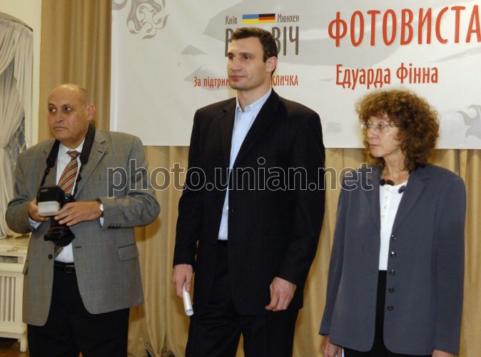 Депутат Киевсовета Виталий Кличко, справа, и автор работ, немецкий фотограф украинского происхождения Эдуард Финн, слева, на открытии фотовыставки, посвященной жителям двух городов-побратимов Киеву и Мюнхену в Киеве в пятницу, 16 ноября 2007 г. Экспозиция выставки представлена жаровыми фотографиями, сделанными автором на улицах Киева и Мюнхена в период с 2003 по 2007 гг. На фотографиях лица обычных людей в минуты работы и отдыха, радости и печали. Выставка продлится до 30 ноября 2007 г.Фото Павла Терехова / УНИАН