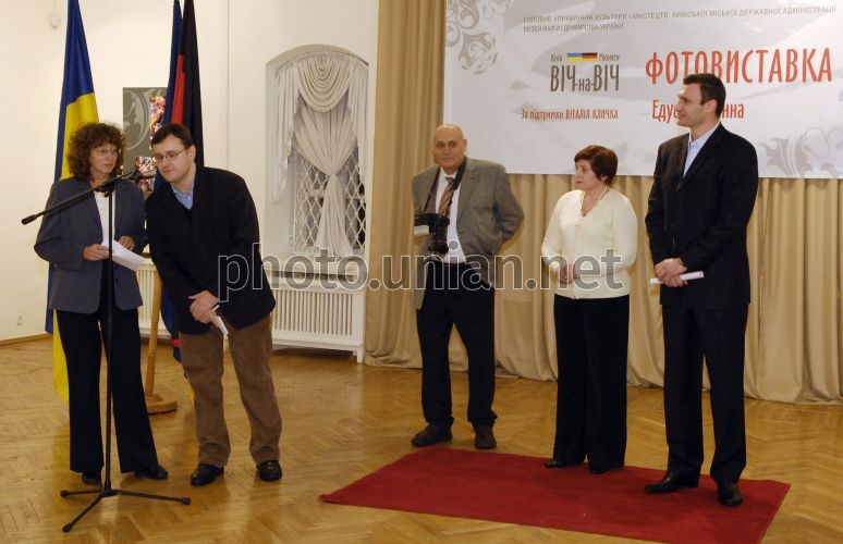 Депутат Киевсовета Виталий Кличко, справа, и автор работ, немецкий фотограф украинского происхождения Эдуард Финн, третий слева, на открытии фотовыставки, посвященной жителям двух городов-побратимов Киеву и Мюнхену в Киеве в пятницу, 16 ноября 2007 г. Экспозиция выставки представлена жаровыми фотографиями, сделанными автором на улицах Киева и Мюнхена в период с 2003 по 2007 гг. На фотографиях лица обычных людей в минуты работы и отдыха, радости и печали. Выставка продлится до 30 ноября 2007 г.Фото Павла Терехова / УНИАН