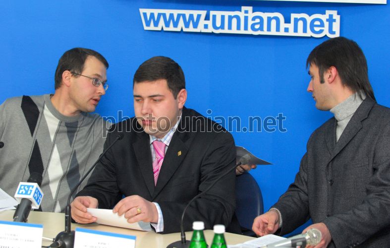 Слева направо: руководитель экономических программ ОО “Центр исследований корпоративных отношений» Вячеслав Бутко, председатель ОО «Комитет защиты киевлян» Вячеслав Димсков, юрист ОО «Центр исследований корпоративных отношений» Павел Золотарев во время пресс-конференции в УНИАН “ОО "Комитет защиты киевлян" - о проблемных вопросах жилищного строительства в столице” в Киеве в четверг, 29 ноября 2007 г. Фото Дмитрия Куприяна / УНИАН
