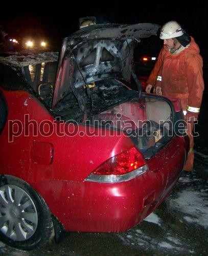Пожарный осматривает машину после тушения пожара на месте ДТП на автотрассе "Бердичев-Житомир" в пригороде Бердичева (Житомирская обл.), в пятницу, 7 декабря 2007 г. В Житомире для контроля за ситуацией на автодорогах установят десять видеокамер. Об этом в пятницу, 7 декабря, на расширенном заседании коллегии прокуратуры Житомирской области по вопросам соблюдения законодательства о безопасности дорожного движения и состояния прокурорского надзора сообщила Житомирский городской председатель Вера Шелудченко. Фото Владимира Соболя / УНИАН