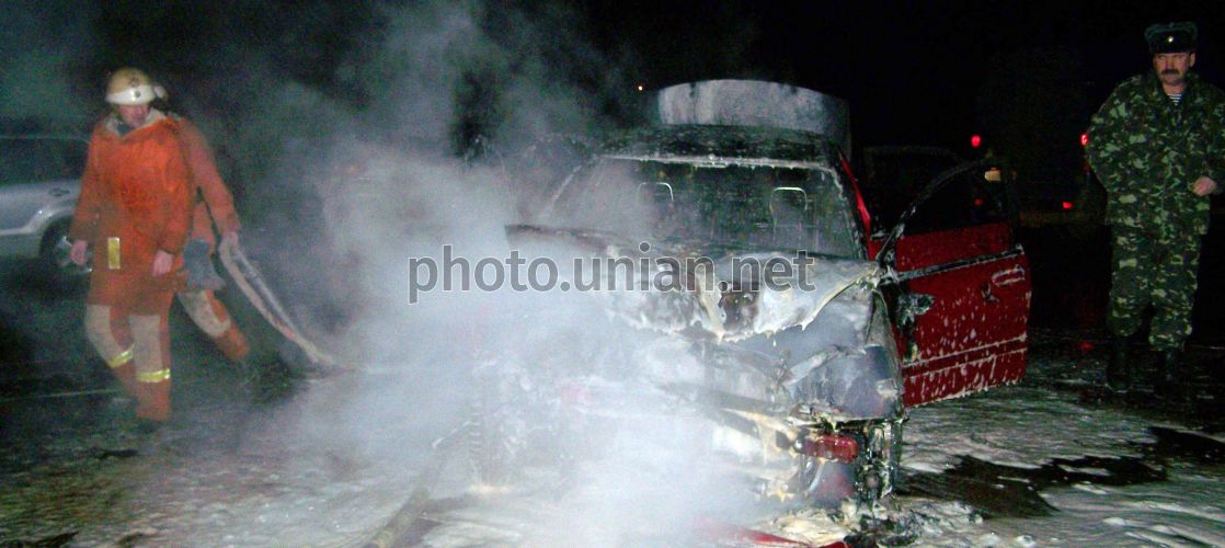 Пожарные осматривают машину после тушения пожара на месте ДТП на автотрассе ”Бердичев-Житомир” в пригороде Бердичева (Житомирская обл.), в пятницу, 7 декабря 2007 г. В Житомире для контроля за ситуацией на автодорогах установят десять видеокамер. Об этом в пятницу, 7 декабря, на расширенном заседании коллегии прокуратуры Житомирской области по вопросам соблюдения законодательства о безопасности дорожного движения и состояния прокурорского надзора сообщила Житомирский городской председатель Вера Шелудченко. Фото Владимира Соболя / УНИАН