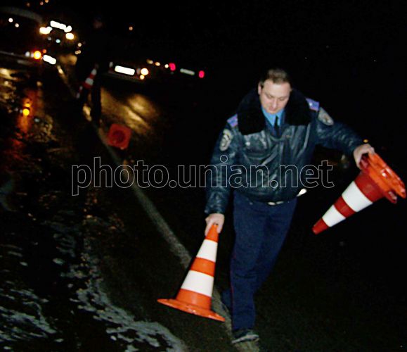 Сотрудник госавтоинспекции устанавливает ограничительные знаки на месте ДТП на автотрассе ”Бердичев-Житомир” в пригороде Бердичева (Житомирская обл.), в пятницу, 7 декабря 2007 г. В Житомире для контроля за ситуацией на автодорогах установят десять видеокамер. Об этом в пятницу, 7 декабря, на расширенном заседании коллегии прокуратуры Житомирской области по вопросам соблюдения законодательства о безопасности дорожного движения и состояния прокурорского надзора сообщила Житомирский городской председатель Вера Шелудченко. Фото Владимира Соболя / УНИАН