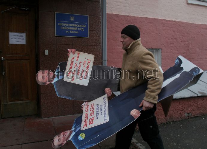 Активист Блока Кличко уносит картонное изображение Леонида Черновецкого после пикетирования помещения Шевченковского суда Киева в понедельник, 10 декабря 2007 г. В Шевченковском районном суде г. Киева было запланировано предварительное слушание дела «Виталий Кличко против городской власти», которое было перенесено. Виталий Кличко требует отменить все решения сессии Киеврады от 1 октября 2007 года, во время которой было роздано свыше 2 000 гектаров столичных земель. Фото Александра Синицы / УНИАН